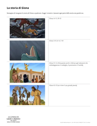 Per aiutarli a studiare la storia di Giona, chiedi loro di completare la scheda “La storia di Giona” individualmente, a coppie o in piccoli gruppi. In alternativa, puoi fornire loro solo i passi scritturali della scheda; invitali poi a fare un semplice disegno e un breve riassunto di ciascun passo.