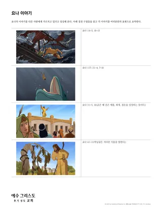 학생들이 요나의 이야기를 공부하는 데 도움이 되도록 유인물 “요나 이야기”를 개별적으로, 또는 둘씩 짝지어서, 또는 소그룹으로 완료해 보라고 한다. 또는 학생들에게 유인물에 있는 성구만 제공하고, 간단한 그림을 그리게 한 다음, 각 성구에 대한 요약을 적어 보라고 할 수도 있다.
