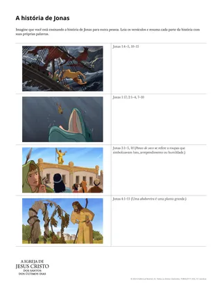 Para ajudar os alunos a estudar o relato de Jonas, você pode convidá-los a completar o material complementar “A história de Jonas” individualmente, em duplas ou em pequenos grupos. Como alternativa, você pode fornecer aos alunos apenas as passagens de escritura do material complementar e convidá-los a fazer um esboço de uma ilustração simples e escrever um resumo de cada passagem.