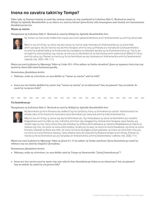 Ny fanasana hamaky sy ny fanontaniana etsy ambany dia manasa ny mpianatra hamantatra fahamarinana iray avy ao amin’ny hafatr’i Mika. Ny fanampiana ny mpianatra hamantatra ireo fahamarinana avy ao amin’ny andinin-tsoratra masina iray dia afaka manampy amin’ny fanaovana ny fandalinan’izy ireo ny soratra masina ho misy lanjany kokoa. Ny fandalinana soratra masina amin’ny fomba manan-danja dia singa iray manan-danja amin’ny fanorenana finoana an’i Jesoa Kristy sy fiovam-po ho an’i Jesoa Kristy. (Raha mila fanofanana fanampiny mikasika ny fanontaniana izay manampy ny mpianatra hamantatra sy hilaza fahamarinana mampiova fo dia jereo ny “Mifantoha amin’ireo fahamarinana izay mitondra ho amin’ny fiovampo sy manorina finoana an’i Jesoa Kristy” ao amin’ny Fahaiza-manao ho fampivoarana ny mpampianatra.)