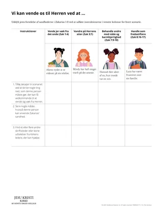 Følgende aktivitet kan hjælpe eleverne til at få en dybere forståelse af de sandheder, de finder frem til hos Zakarias. Giv hver gruppe en kopi af uddelingsarket: »Vi kan vende os til Herren ved at …« Bed eleverne om at arbejde to og to eller i små grupper for at færdiggøre uddelingsarket. Alternativt kan I tildele forskellige scenarier til forskellige makkerpar og få dem til at forberede sig på at dele med makkerpar, der arbejdede på et andet scenarie.