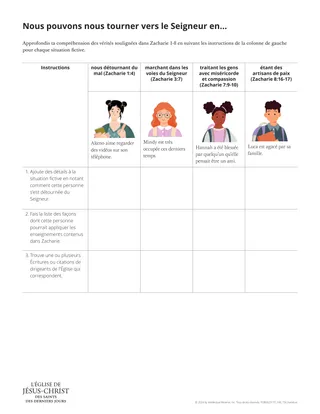 L’activité suivante permettra aux apprenants d’approfondir leur compréhension des vérités qu’ils ont relevées dans Zacharie. Distribuez à chaque groupe un exemplaire du document à distribuer « Nous pouvons nous tourner vers le Seigneur en… ». Demandez aux apprenants de se mettre en binômes ou en petits groupes et de compléter ce document. Sinon, attribuez les situations fictives aux binômes et demandez-leur de se préparer à en discuter avec un binôme qui a travaillé sur une situation fictive différente.