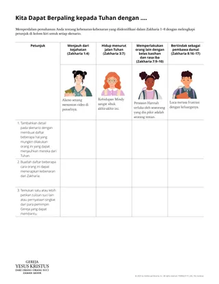 Kegiatan berikut dapat membantu memperdalam pemahaman siswa mengenai kebenaran-kebenaran yang mereka identifikasi dari Zakharia. Berilah setiap kelompok salinan dari selebaran “Kita Dapat Kembali kepada Tuhan Dengan ….” Ajaklah siswa untuk bekerja secara berpasangan atau dalam kelompok-kelompok kecil untuk melengkapi selebaran tersebut. Sebagai alternatif, Anda dapat menugaskan skenario yang berbeda kepada pasangan yang berbeda dan meminta mereka bersiap untuk berbagi dengan pasangan-pasangan yang mengerjakan skenario yang berbeda.