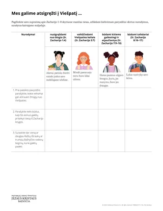 Toliau pateikta užduotis gali padėti mokiniams geriau suprasti jų įvardytas tiesas iš Zacharijo knygos. Kiekvienai grupei išdalykite dalijamosios medžiagos „Mes galime atsigręžti į Viešpatį…“ kopijas. Paprašykite mokinių dalijamosios medžiagos užduotis atlikti poromis arba mažose grupėse. Arba galite skirtingoms poroms paskirti skirtingus pavyzdžius ir paprašyti jų pasiruošti pasidalyti su poromis, kurios dirbo su kitu pavyzdžiu.