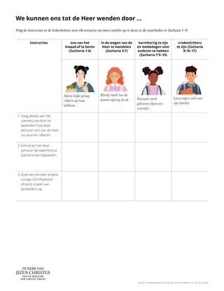 De volgende activiteit kan de cursisten meer begrip geven van de waarheden die ze in Zacharia hebben gevonden. Geef elk groepje een kopie van de hand-out ‘We kunnen ons tot de Heer wenden door …’ Laat de cursisten met een klasgenoot of in groepjes aan de opdracht werken. U kunt ook verschillende scenario’s aan verschillende duo’s toewijzen en ze zich laten voorbereiden om erover te praten met duo’s die aan een ander scenario hebben gewerkt.