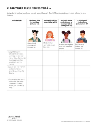 Følgende aktivitet kan bidra til å utdype elevenes forståelse av sannhetene de fant i Sakarja. Gi hver gruppe eksemplarer av utdelingsarket “Vi kan vende oss til Herren ved å …”. Be elevene gå sammen to og to eller i små grupper for å fylle ut utdelingsarket. Alternativt kan du gi forskjellige situasjonsbeskrivelser til forskjellige par, og be dem forberede seg på å dele med par som jobbet med en annen situasjonsbeskrivelse.