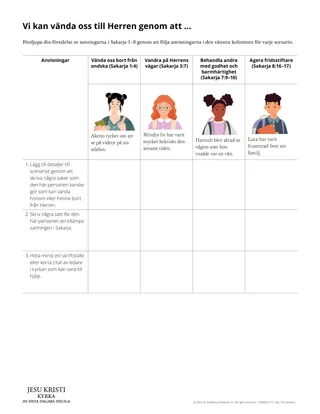 Följande aktivitet kan hjälpa eleverna att fördjupa sin kunskap om sanningarna de identifierade i Sakarja. Dela ut exemplar av utdelningsbladet ”Vi kan vända oss till Herren genom att …” till varje grupp. Låt eleverna arbeta i par eller små grupper med att fylla i utdelningsbladet. Alternativt kan du tilldela olika elevpar olika scenarier och låta dem förbereda sig för att berätta om dem för par som jobbade med ett annat scenario.