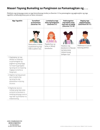 Ang sumusunod na aktibidad ay makatutulong sa pagpapalalim ng pag-unawa ng mga estudyante sa mga katotohanang natukoy nila mula sa Zacarias. Bigyan ang bawat grupo ng mga kopya ng handout na “Maaari Tayong Bumaling sa Panginoon sa Pamamagitan ng …” Sabihin sa mga estudyante na gumawa nang magkakapartner o sa maliliit na grupo para makumpleto ang handout. Bilang alternatibo, maaari kang magtalaga ng iba’t ibang sitwasyon sa magkakaibang magkapartner at sabihin sa kanila na maghandang magbahagi sa mga magkapartner na gumawa sa ibang sitwasyon.