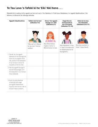 ʻE lava ke tokoni ʻa e ʻekitivitī ko ʻení ke fakaloloto e mahino ʻa e kau akó ki he ngaahi moʻoni naʻa nau ʻilo meia Sakalaiá. ʻOange ki he kulupu takitaha ha ngaahi tatau ʻo e laʻipepa tufa “Te Tau Lava ʻo Tafoki ki he ʻEikí ʻAki …” Fakaafeʻi e kau akó ke nau ngāue tautau toko ua pe fakakulupu iiki ke fakakakato ʻa e laʻipepa tufá. Pe ko hoʻo vahe ha ngaahi tūkunga kehekehe ki ha ngaahi hoa kehekehe pea ʻai ke nau teuteu ke vahevahe mo ha ngaahi hoa naʻe ngāue ʻi ha tūkunga kehe.