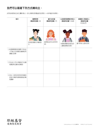 以下活動可以幫助學生深入了解他們從撒迦利亞書中找到的真理。給每組一份「我們可以藉由……來轉向主」的講義,請學生以兩人或小組的形式完成講義。或者,你可以給每對同伴分派不同的情境,然後讓他們準備與分到不同情境的同伴團分享。