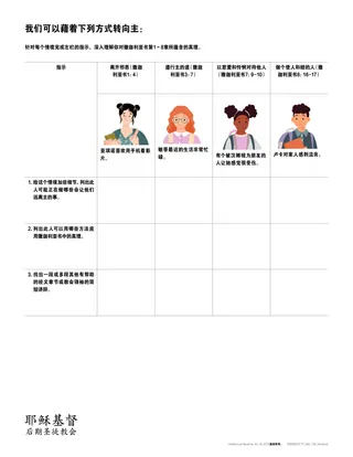 以下活动可以帮助学生深入了解他们从撒迦利亚书中找到的真理。给每组一份「我们可以藉由……来转向主」的讲义,请学生以两人或小组的形式完成讲义。或者,你可以给每对同伴分派不同的情境,然后让他们准备与分到不同情境的同伴团分享。