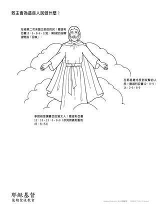 為了幫助學生進一步了解,救主在這些事件中會如何幫助祂的人民,不妨使用講義「救主會為……做什麼」。不妨請全班一起讀這幾節經文,請學生在每個問題下面寫一些字句,來描述救主應許會為忠信者做什麼。