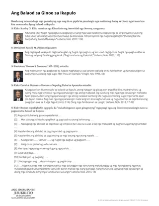 Ang kauban nga handout nga, “Ang Balaod sa Ginoo sa Ikapulo,” mopalawom sa pagsabot sa mga estudyante sa mga panalangin nga ihatag sa Ginoo samtang atong tumanon ang Iyang balaod. Ikonsiderar ang pagbahinbahin sa mga estudyante ngadto sa gagmayng grupo ug paghatag sa matag grupo og kopya sa handout. Pwedeng magpulihanay ang mga estudyante nga kusgon og basa ang mga kinutlo. Human mabasa ang matag kinutlo, pwedeng magdugang ang mga estudyante og mga panalangin diha sa graphics sa ilang mga journal sa pagtuon.