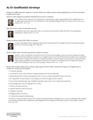 A mellékelt Az Úr tizedfizetési törvénye című kiosztmány segíthet elmélyíteni a tanulók ismereteit azokról az áldásokról, melyeket az Úr ad nekünk, amikor engedelmeskedünk az Ő törvényének. A tanulókat párokra vagy kis csoportokra is oszthatod, és adhatsz mindegyiküknek egy-egy példányt a kiosztmányból. A tanulók egymást váltva felolvashatják az idézeteket. Az egyes idézetek elolvasása után a tanulók további áldásokkal egészíthetik ki a tanulmányozási naplójukba rajzolt ábrát.
