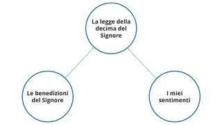 Indica il cerchio con scritto “I miei sentimenti”. Informa gli studenti che alla fine della lezione avranno l’opportunità di scrivere i loro sentimenti riguardo alla decima. Magari è il momento giusto per riflettere su eventuali preoccupazioni o difficoltà che affrontano nel pagare la decima. Potrebbero riflettere anche su come trarre beneficio dall’individuare le benedizioni che il Signore ha promesso a chi paga la decima.