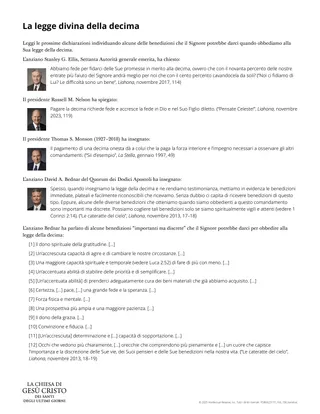 La scheda “La legge divina della decima” può approfondire la comprensione degli studenti delle benedizioni che il Signore ci dà se obbediamo alla Sua legge. Potresti dividere la classe in piccoli gruppi e fornire a ciascun gruppo una copia della scheda. Gli studenti possono leggere a turno le citazioni ad alta voce. Dopo aver letto ogni citazione, possono aggiungere altre benedizioni al grafico nel loro diario di studio.