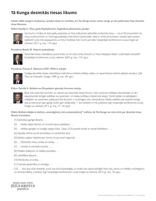 Kad būsit pārrunājuši desmitās tiesas maksāšanas svētības, jūs varētu norādīt, ka daži cilvēki, kuri maksā desmito tiesu, iespējams, nesaņems cerētās svētības un joprojām var saskarties ar finansiālām grūtībām. Viņi varētu prātot, kādēļ gan viņiem būtu jāturpina maksāt desmito tiesu. Jūs varētu izlasīt Maleahija 3:14, 16–17 un pievērst uzmanību tam, ko Tas Kungs apsolīja tiem cilvēkiem, kuri paliks uzticīgi un Viņam paklausīs.