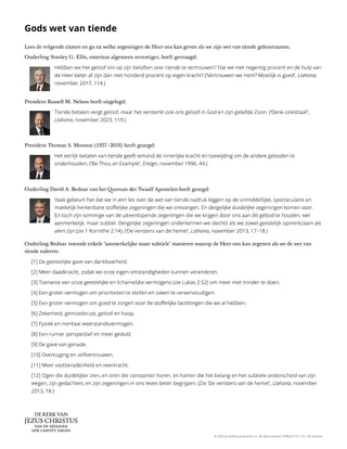 De bijbehorende hand-out, ‘De wet van tiende van de Heer’, kan de cursisten meer inzicht geven in de zegeningen die de Heer ons geeft als we zijn wet gehoorzamen. Deel de cursisten eventueel in groepjes in en geef elk groepje een exemplaar van de hand-out. De cursisten kunnen om de beurt de citaten voorlezen. Laat de cursisten na elk citaat nog meer zegeningen aan het schema in hun studiedagboek toevoegen.