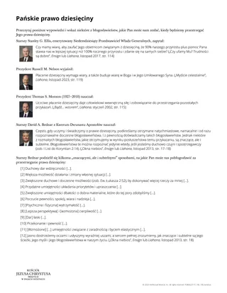 Poniższa ulotka pt. „Pańskie prawo dziesięciny” może pogłębić zrozumienie przez uczniów błogosławieństw, które Pan nam daje, gdy przestrzegamy Jego prawa. Możesz podzielić uczniów na małe grupy i wręczyć im po egzemplarzu ulotki. Uczniowie mogą po kolei czytać na głos cytaty. Po przeczytaniu każdego cytatu uczniowie mogą dodać więcej błogosławieństw do grafik w swoich dziennikach do studiowania.
