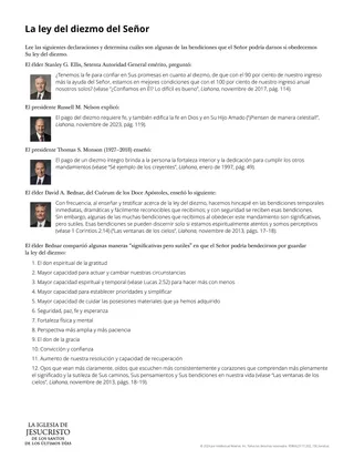 El volante adjunto, “La ley del diezmo del Señor”, puede contribuir a profundizar la comprensión de los alumnos en cuanto a las bendiciones que el Señor nos proporciona cuando obedecemos Su ley. Considere organizar a los alumnos en grupos pequeños y entregar a cada grupo una copia del volante. Ellos pueden turnarse para leer las citas en voz alta. Después de leer cada cita, podrían agregar más bendiciones a los diagramas de sus diarios de estudio.