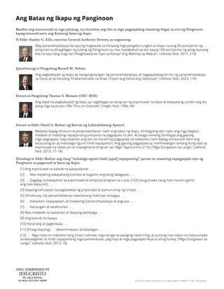 Ang kalakip na handout na “Ang Batas ng Ikapu ng Panginoon,” ay makapagpapalalim sa pag-unawa ng mga estudyante sa mga pagpapalang ibinibigay sa atin ng Panginoon kapag sinusunod natin ang Kanyang batas. Maaari mong hatiin sa maliliit na grupo ang mga estudyante at bigyan ang bawat grupo ng kopya ng handout. Maaaring magsalitan ang mga estudyante sa pagbabasa ng mga sipi. Pagkatapos basahin ang bawat sipi, maaaring magdagdag ang mga estudyante ng iba pang mga pagpapala sa graphics sa kanilang study journal.