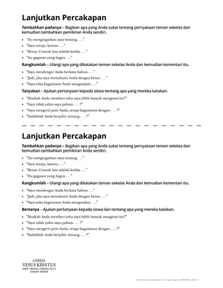 Apakah kegiatan ini memfasilitasi pengalaman yang berpusat pada Kristus, berdasarkan pada tulisan suci, dan berfokus kepada pemelajar? Lihat Pelatihan Mengadopsi dan Mengadaptasikan Kurikulum Seminari untuk mengetahui lebih lanjut tentang hal ini.