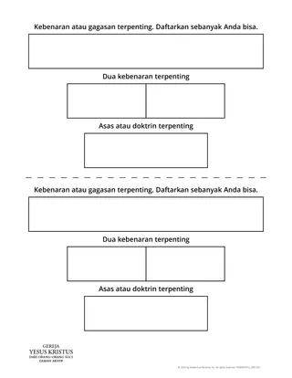 Berikan kepada setiap siswa selembar kertas dan ajaklah mereka untuk melipatnya menjadi tiga bagian. Siswa dapat membuat halaman judul yang memuat asas atau doktrin yang telah mereka identifikasi. Siswa dapat membuat halaman-halaman berikutnya berisi subjudul dan detail dari apa yang sedang mereka pelajari. Anda dapat mengajak mereka untuk menyisakan ruang di bagian belakang pamflet untuk menuliskan gol atau rencana apa pun yang mereka buat selama pelajaran.