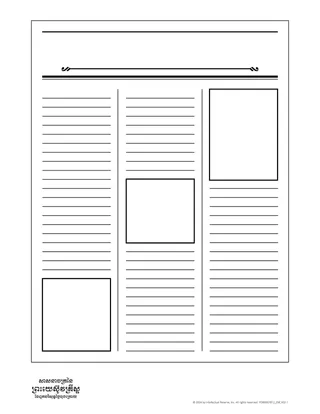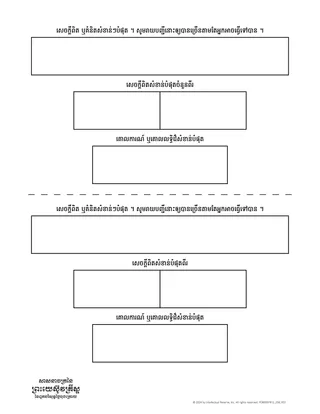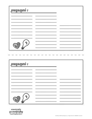 សូមបង្កើតគម្រោងដែលសិស្សអាចប្រើដើម្បីរៀបចំមេរៀន សុន្ទរកថា សារលិខិតខ្លីមួយ ឬរបៀបដើម្បីចែកចាយវគ្គបទគម្ពីរ ។ អ្នកអាចផ្តល់គំរូនៃគម្រោងមេរៀនដែលមិនទាន់បានសរសេរមួយ ដែលសិស្សកត់ត្រាការរកឃើញរបស់ពួកគេ ។ អ្នកអាចណែនាំសិស្សឲ្យរួមបញ្ចូលព័ត៌មានផ្សេងៗគ្នានៅក្នុងប្រអប់នីមួយៗ ។ ឧទាហរណ៍ សិស្សអាចសរសេរចំណងជើងនៅក្នុងប្រអប់ទីមួយ សង្ខេបខគម្ពីរសំខាន់ៗនៅក្នុងប្រអប់បន្ទាប់នោះ រាយបញ្ជីឧទាហរណ៍ ឬដំណើររឿងផ្ទាល់ខ្លួននៅក្នុងប្រអប់វែងទាំងបី និងសរសេរទីបន្ទាល់នៅក្នុងប្រអប់ចុងក្រោយ ។