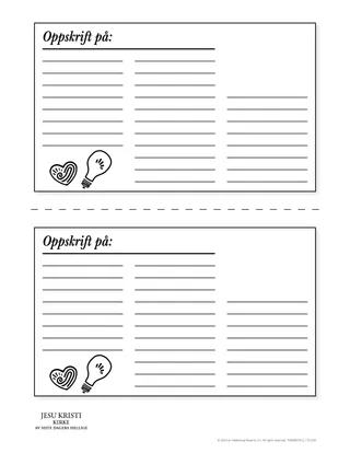 Lag en oversikt som elevene kan bruke til å forberede en kort leksjon, tale, et budskap eller en måte å dele et skriftsted på. Du kan gi elevene en tom mal der de skriver ned det de oppdager. Du kan be elevene ta med forskjellig informasjon i hver rute. Elevene kan for eksempel skrive en tittel i den første ruten, oppsummere viktige vers i neste rute, lage en liste over eksempler eller personlige historier i de tre lange rutene, og skrive et vitnesbyrd i den siste ruten.