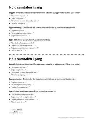 Dette er et nyttig redskap for klasser med elever som er stille eller usikre på hvordan eller hva de skal dele. Vis listen over uttrykk nedenfor for å hjelpe elevene å formulere hva de kan dele. Be dem studere en skriftstedbolk og forberede seg til å dele ved hjelp av ett eller flere kraftuttrykk. Tilrettelegg drøftingen eller be en elev lede den.