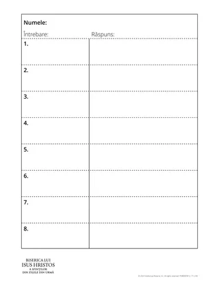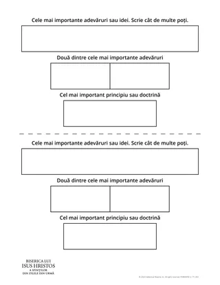 Creați un rezumat pe care cursanții să-l poată folosi pentru a pregăti o lecție scurtă, o cuvântare, un mesaj sau un mod de a împărtăși un fragment scriptural. Puteți oferi un șablon de rezumat necompletat în care cursanții să-și consemneze descoperirile. Puteți instrui cursanții să includă informații diferite în fiecare casetă. De exemplu, cursanții pot să scrie un titlu în prima casetă, să rezume versete cheie în caseta următoare, să enumere exemple sau întâmplări personale în cele trei casete lungi și să scrie o mărturie în ultima casetă.