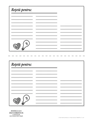 Cursanții creează rețete folosind ceea ce învață. Puteți începe arătându-le un exemplu de rețetă care include ingrediente, măsuri și instrucțiuni. Apoi, ajutați cursanții să urmeze acel tipar pentru a organiza ceea ce învață. Ei își pot intitula rețeta „Cum să fii un misionar puternic”, „Cum să-l urmezi pe profet” sau „Moduri de a studia mai eficient din scripturi”. Apoi, cursanții includ elementele pe care le consideră esențiale folosind versete și citate. De exemplu, când studiază 2 Cronici 14-16, un cursant poate menționa o rețetă pentru a-L căuta și a-L găsi pe Domnul. Încurajați-i să fie creativi în rețetele lor. Ei pot face un desen care să reprezinte produsul final al rețetei.