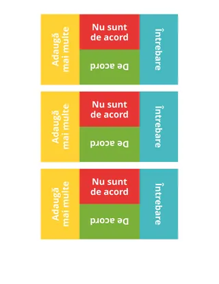 Oferiți cartonașe pe care cursanții să le poată ține ca răspunsuri vizuale la întrebările pe care le adresați. Cursanții pot folosi cartonașele pentru a indica răspunsurile lor sau când sunt pregătiți să-și împărtășească sau să discute despre gândurile lor. Exemplele de mai jos sunt tipuri de cartonașele de participare.