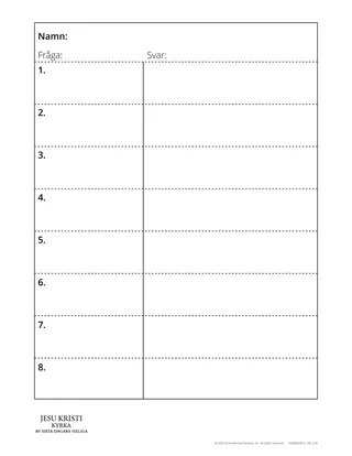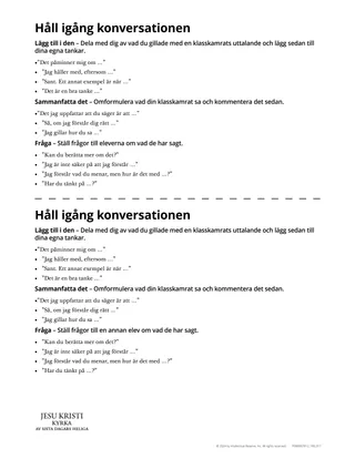 Variation: Skriv några påståenden om ämnet för lektionen som är viktiga för eleverna att förstå. Ta också med några falska påståenden. Låt sedan eleverna gissa om de är sanna eller falska. Eleverna kan sedan söka i lektionens skriftställen för att se om de hade rätt. Fråga eleverna vad de hittade under aktiviteten. Förvissa dig om att eleverna efter aktiviteten förstår vilka påståenden som var sanna och vilka som var falska.