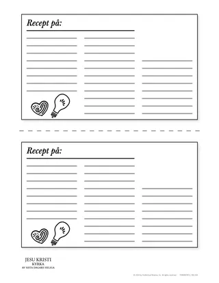 Eleverna skapar recept med hjälp av det de lär sig. Du kan börja med att visa dem ett exempel på ett recept som innehåller ingredienser, måttangivelser och instruktioner. Hjälp sedan eleverna att följa det här mönstret för att organisera det de lär sig. De kan ge sitt recept rubriken ”Hur man blir en kraftfull missionär”, ”Hur man följer profeten” eller ”Olika sätt att studera skrifterna mer effektivt”. Sedan tar eleverna med vad de tycker är nödvändiga beståndsdelar med hjälp av skriftställen och citat. När ni till exempel studerar 2 Krönikeboken 14–16 kan eleverna skriva ett recept på att söka och hitta Herren. Uppmuntra dem att vara kreativa med sina recept. De kan rita en bild som representerar slutprodukten i receptet.