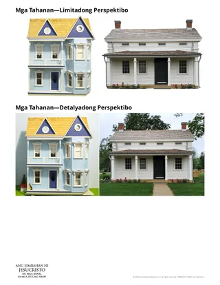 Maaari mong anyayahan ang mga estudyante na mag-isip ng isang object lesson o analohiya na makapaglalarawan ng kahalagahan ng pagtingin sa mga bagay mula sa ibang pananaw. Anyayahan silang ibahagi ang kanilang mga ideya sa klase. O maaari mong ipakita ang mga kasamang larawan na may pamagat na “Mga Tahanan–Limitadong Pananaw” at anyayahan ang mga estudyante na talakayin ang mga sumusunod na tanong sa isang kapartner: