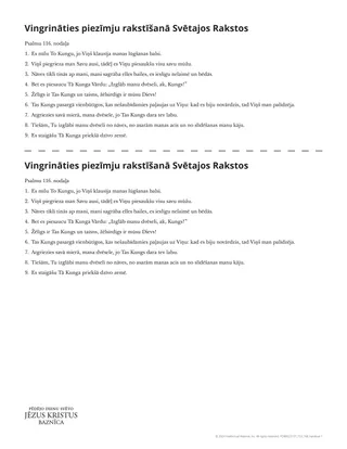 Viens veids, kā palīdzēt audzēkņiem vingrināties, ir iedot katram audzēknim izdales materiālu „Vingrināties Svēto Rakstu iezīmēšanā”. Ja jūsu audzēkņi izmanto Svētos Rakstus papīra formātā, nevis izdales materiālu, jūs varētu nokopēt Svēto Rakstu lappusi, kas ietver Psalmu 116:1–9, lai audzēkņi varētu vingrināties. Piedāvājot audzēkņiem dažas no šīm iespējām, jūs ļaujat viņiem izmēģināt dažādas metodes, lai redzētu, kā viņi vēlas vai nevēlas iezīmēt savus personīgos Svētos Rakstus. Audzēkņi varētu izlasīt izdales materiāla pirmos četrus pantus (Psalmu 116:1–4) un pielietot vienu iezīmēšanas metodi, bet attiecībā uz pārējiem pieciem pantiem (Psalmu 116:5–9) — citu iezīmēšanas metodi. Ja audzēkņi izmanto Svētos Rakstus elektroniskajā versijā, viņi varētu lasīt un iezīmēt tos pašus pantus Evaņģēlija bibliotēkā, pielietojot dažādas metodes. Jūs varētu parādīt audzēkņiem, kā viņi var dzēst savas digitālās piezīmes, ja viņi to vēlētos darīt pēc vingrināšanās.