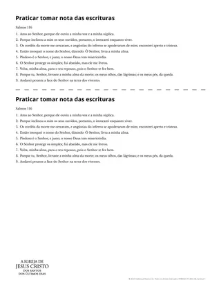 Uma maneira de ajudar os alunos a praticar é dar a cada um deles uma cópia do material complementar “Praticar como fazer anotações nas escrituras”. Caso seus alunos usem escrituras em papel, você pode, em vez de usar o material complementar, tirar cópias de Salmos 116:1–9 para os alunos praticarem. Fornecer uma dessas opções permite que os alunos experimentem diferentes métodos de marcação para decidirem como marcar suas próprias escrituras. Os alunos podem escolher um método para marcar os quatro primeiros versículos do material complementar (Salmos 116:1–4) e outro método diferente de marcação para os cinco versículos finais (Salmos 116:5–9). Caso os alunos estejam usando escrituras digitais, eles podem ler e marcar os mesmos versículos na Biblioteca do Evangelho usando métodos variados. Você pode mostrar como excluir as marcações digitais caso eles queiram fazê-lo após praticar.