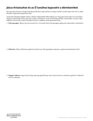 Adj lehetőséget a tanulóknak, hogy gyakorolják A fiatalság erősségéért: Kalauz a döntések meghozatalához füzetben felállított mintát a saját helyzetükben. Ehhez felhasználhatod a Jézus Krisztushoz és az Ő tanához kapcsolni a döntéseinket című kiosztmányt.
