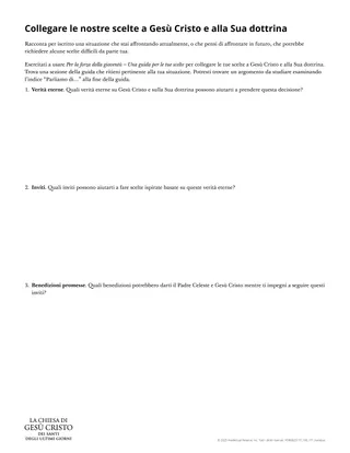 Dai agli studenti la possibilità di esercitarsi con la propria situazione usando il modello stabilito in Per la forza della gioventù – Una guida per le tue scelte. Per farlo puoi usare la scheda “Collegare le nostre scelte a Gesù Cristo e alla Sua dottrina”.