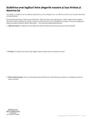 Asigurați-vă că membrii clasei înțeleg că broșura Pentru întărirea tineretului – Îndrumar pentru a face alegeri este un instrument care ne poate ajuta să stabilim o legătură între alegerile noastre și Isus Hristos.