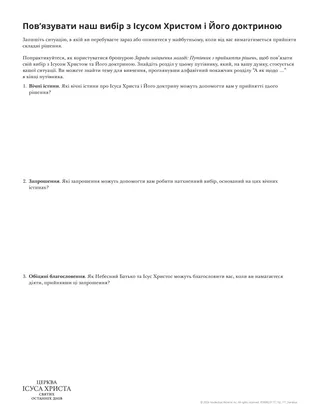 Надайте студентам можливість попрактикуватися у застосовуванні моделі, викладеної в брошурі “Заради зміцнення молоді: Путівник з прийняття рішень” у власних ситуаціях. Для цього ви можете скористатися роздатковим матеріалом “Пов’язувати наш вибір з Ісусом Христом та Його вченням”.