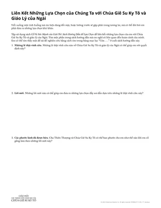 Trong suốt cuộc đời mình, chúng ta liên tục phải đưa ra những lựa chọn. Khi chúng ta cảm thấy quá sức trong việc đưa ra những lựa chọn đúng đắn, Chúa Giê Su Ky Tô và giáo lý của Ngài có thể ban cho chúng ta sức mạnh và sự hướng dẫn. Chúng ta có thể tìm đến sách Cổ Vũ Sức Mạnh của Giới Trẻ: Sách Hướng Dẫn để Lựa Chọn để tìm kiếm những lẽ thật về Chúa Giê Su Ky Tô và giáo lý của Ngài. Bài học này có thể giúp học viên tập sử dụng sách hướng dẫn Cổ Vũ Sức Mạnh của Giới Trẻ để đưa ra những lựa chọn được soi dẫn dựa theo Chúa Giê Su Ky Tô và giáo lý của Ngài.