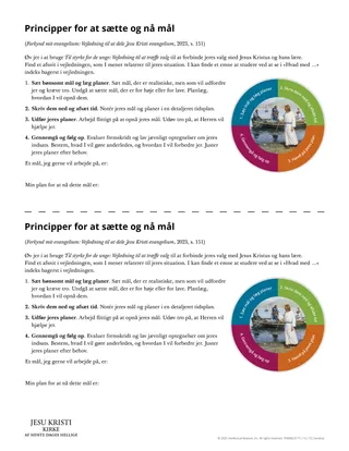 Vælg derefter et af disse mål, og lav ved hjælp af principperne på uddelingsarket et scenarie, hvor en person realistisk set kan udføre hvert trin. Overvej, hvordan I kan involvere Herren i denne proces.