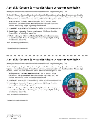 Mindegyik tanulónak adj A célok kitűzésére és megvalósítására vonatkozó tantételek című kiosztmányból. A tanulók a Prédikáljátok evangéliumomat! Útmutató Jézus Krisztus evangéliuma megosztásához (2023) című kiadvány 159–160. oldalairól is tájékozódhatnak.