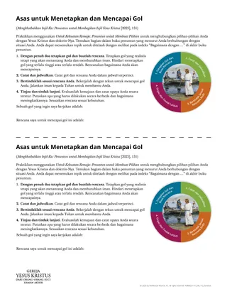 Tulis satu atau dua gol yang ingin Anda capai. Buat rencana terperinci yang menguraikan langkah-langkah yang ingin Anda ambil untuk mencapainya. Pastikan untuk menyertakan dalam rencana Anda bagaimana Anda dapat melibatkan Tuhan dengan gol-gol Anda.