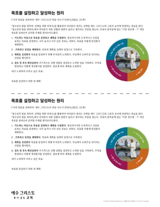 그런 다음, 나열된 목표 중 하나를 선택하고, 유인물에 있는 원리를 사용하여 각 단계를 현실적으로 행할 수 있는 시나리오를 만들어 본다. 이 과정에 어떻게 주님께서 관여하실 수 있게 할 수 있을지 생각해 본다.
