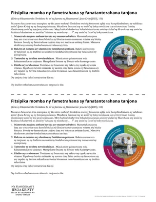 Omeo an’ity taratasy zaraina “Fitsipika mikasika ny fametrahana sy ny fanatanterahana tanjona” ity ny mpianatra tsirairay. Afaka mahazo izany fampahalalana izany koa ny mpianatra ao amin’ny pejy 151 ao amin’ny Torio ny filazantsarako: Torolalana ho an’ny fizarana ny filazantsaran’i Jesoa Kristy (2023).