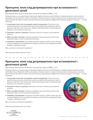 Напишіть одну або дві цілі, яких ви хотіли б досягнути. Складіть детальний план із зазначенням кроків, які ви хотіли б зробити для їхнього досягнення. Обов’язково додайте у свій план, як ви можете залучити Господа до досягнення ваших цілей.