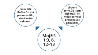 Studenti se možná podělili o tyto pravdy: Jsem dítě Boží a Bůh má pro mě práci, kterou mám vykonat nebo Když vím, že jsem dítě Boží, může mi to pomoci překonávat pokušení. Na tabuli nakreslete kolem Mojžíše 1:3, 6, 12–13 šipky a na konci každé z nich kruh. Do kruhů zapište tyto a případně další pravdy, které studenti objevili. Studenty byste mohli vybídnout, aby si totéž nakreslili do studijního deníku.